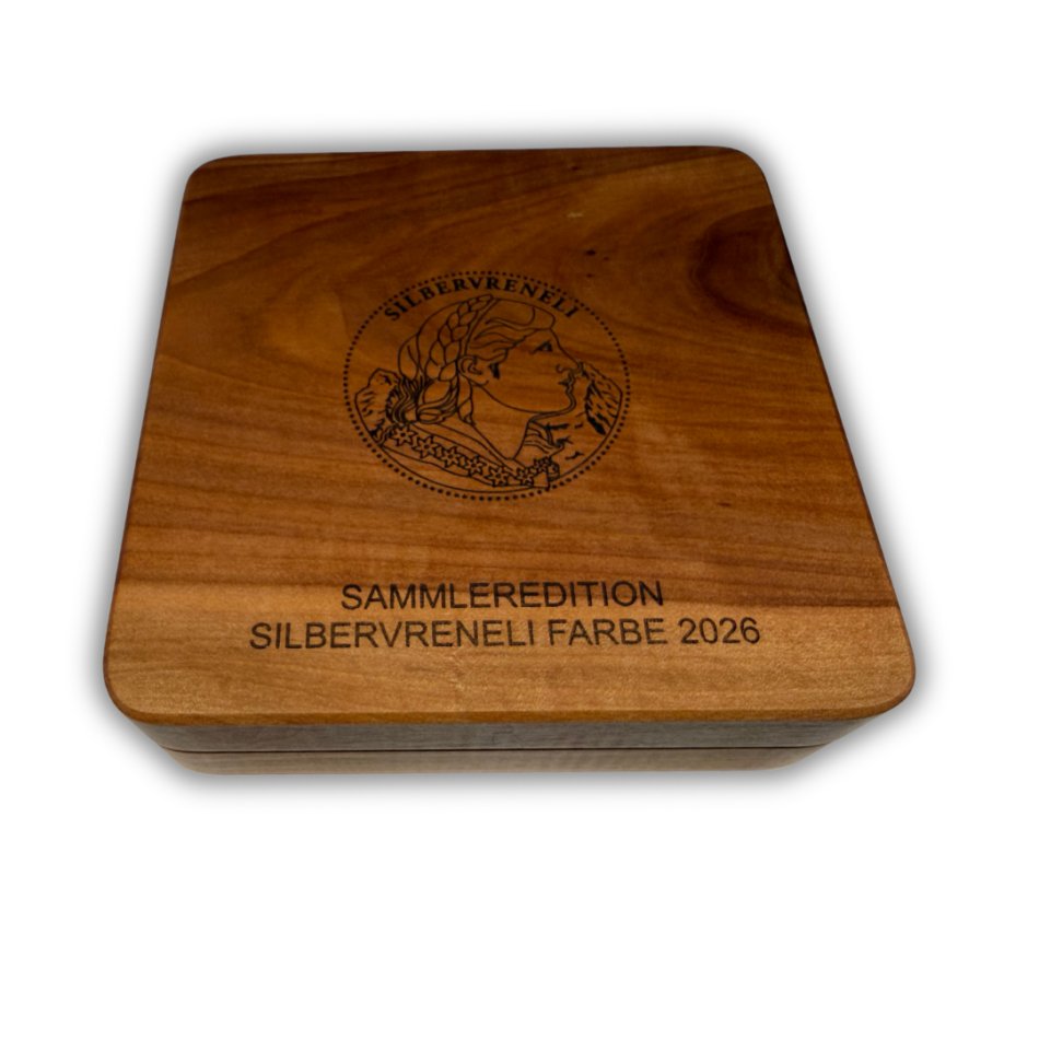 Herzstück der Edition ist das Silbervreneli Klassik 2026 in Farbe – eine exklusive Farbprägung mit einer